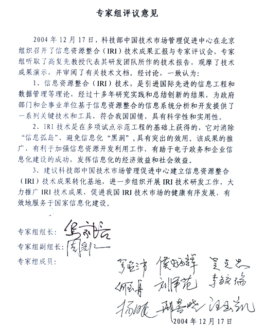 2004年12月17日,信息資源整合(IRI)技術通過科技部專家組評審;