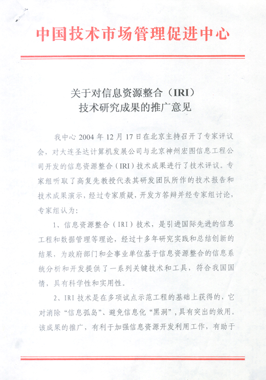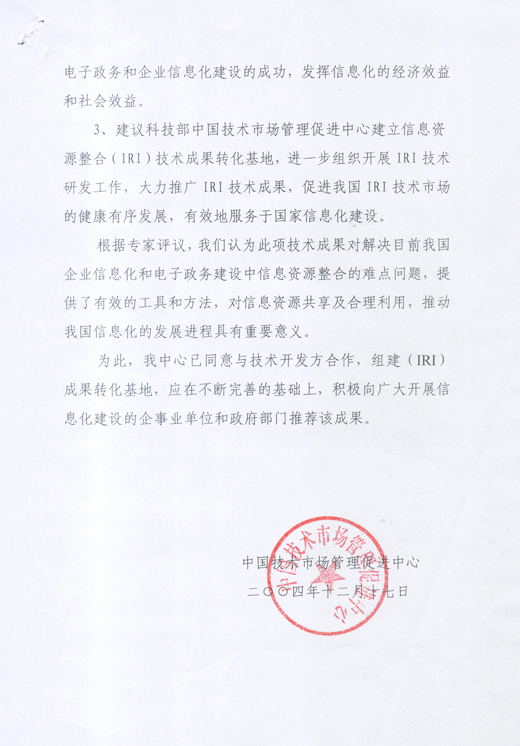 - 根據中國技術市場發展需要,利用IRI技術成果,探索整合提升全國技術市場管理機構和相關服務機構的信息資源管理工作,實現科技信息的共享與交流,并建設相關專業網站。
