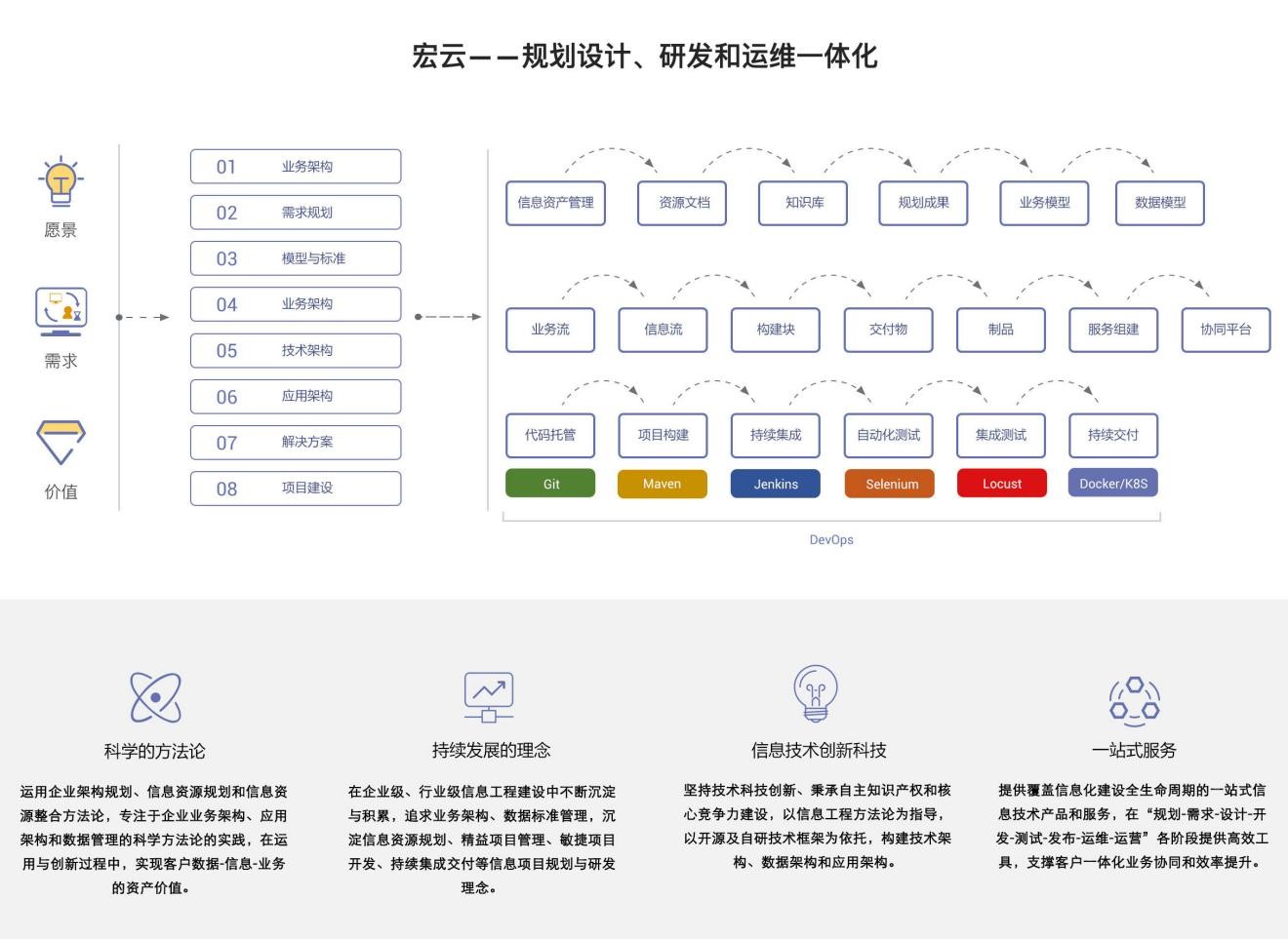依托我公司自主知識(shí)產(chǎn)權(quán)的云效平臺(tái)產(chǎn)品(宏云,HT Cloud),為企業(yè)構(gòu)建IT工程建設(shè)和運(yùn)維管理的統(tǒng)一云生態(tài)支撐環(huán)境,適應(yīng)公有云、私有云和混合云等云環(huán)境,提供規(guī)劃設(shè)計(jì)-研發(fā)-運(yùn)維一體化服務(wù)(DevOps),提供各類基礎(chǔ)開發(fā)套件、各類服務(wù)組件、各類公共業(yè)務(wù)應(yīng)用等核心套件,為企業(yè)快速上云提供技術(shù)全要素支撐。