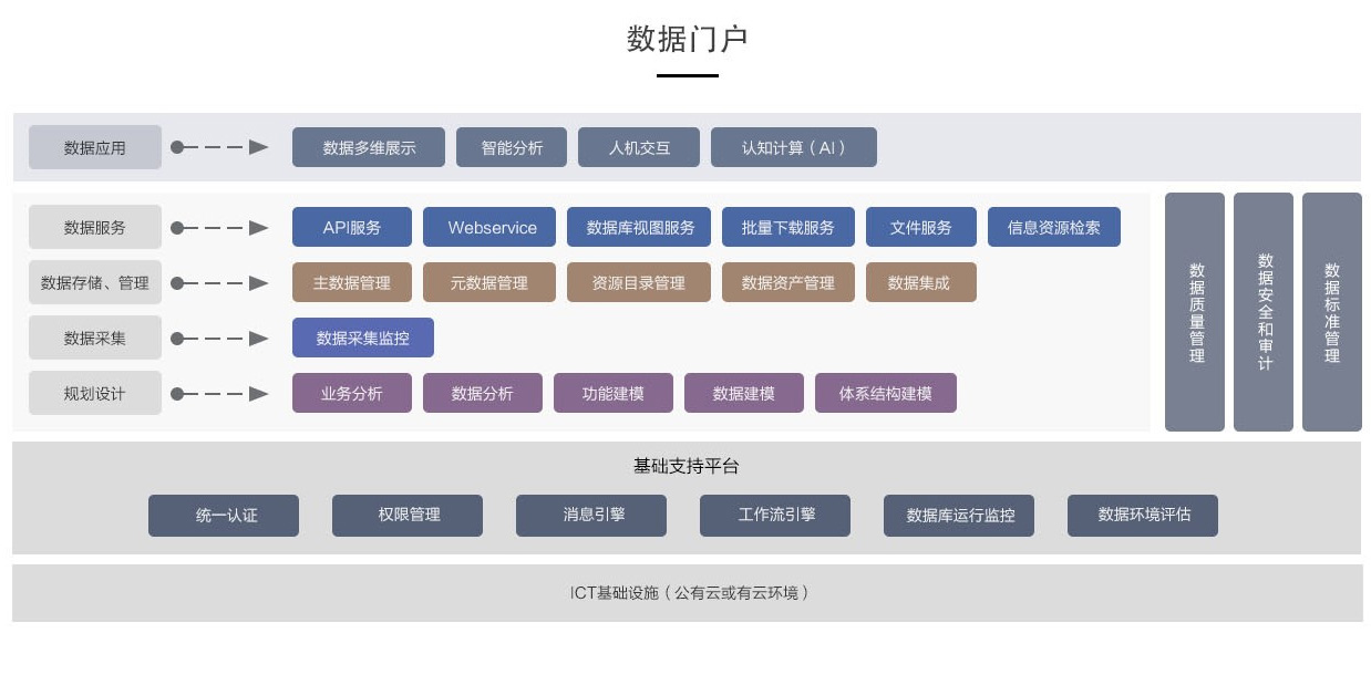 - 數據應用,提供數據門戶、數據資源檢索、數據質量、數據審計、數據安全、數據監控、知識圖譜和數據綜合展示等各類數據管理應用。